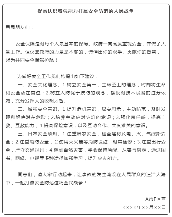 結語:這個段落主要起號召作用。當交代完所要宣傳的內(nèi)容以后,就要號召宣傳對象來落實踐行所宣傳的內(nèi)容,這樣的話,宣傳稿才算完整。