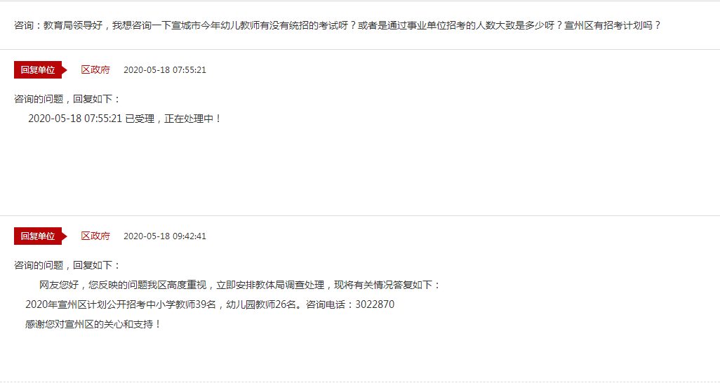 5月18日,有網(wǎng)友在宣城市人民政府互動交流平臺提問:教育局領(lǐng)導(dǎo)好,我想咨詢一下宣城市今年幼兒教師有沒有統(tǒng)招的考試呀?或者是通過事業(yè)單位招考的人數(shù)大致是多少呀?宣州區(qū)有招考計劃嗎?宣城市宣州區(qū)政府給出了如下回復(fù):2020年宣州區(qū)計劃公開招考中小學(xué)教師39名,幼兒園教師26名。更多安徽教師招聘咨詢,請關(guān)注2020年淮北教師招聘考試網(wǎng),后續(xù)會持續(xù)更新!