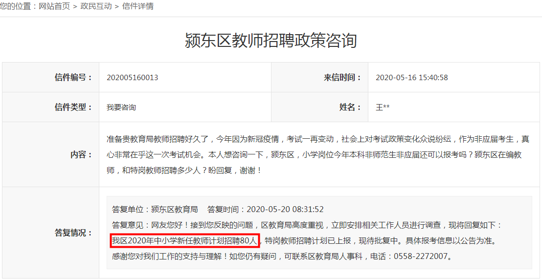 內(nèi)容:準(zhǔn)備貴教育局教師招聘好久了,今年因?yàn)樾鹿谝咔?,考試一再變?dòng),社會(huì)上對(duì)考試政策變化眾說(shuō)紛紜,作為非應(yīng)屆考生,真心非常在乎這一次考試機(jī)會(huì)。本人想咨詢一下,潁東區(qū),小學(xué)崗位今年本科非師范生非應(yīng)屆還可以報(bào)考嗎?潁東區(qū)在編教師,和特崗教師招聘多少人?盼回復(fù),謝謝!答復(fù)情況: