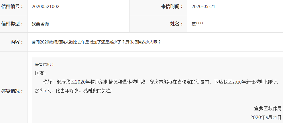 你好!根據(jù)我區(qū)2020年教師編制情況和退休教師數(shù),安慶市編辦在省核定的總量內(nèi),下達(dá)我區(qū)2020年新任教師招聘人數(shù)為7人,比去年略少。感謝您的關(guān)注!