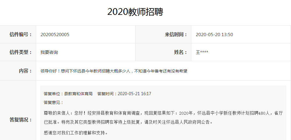 尊敬的來(lái)信人:您好!經(jīng)安排縣教育和體育局調(diào)查,現(xiàn)回復(fù)結(jié)果如下:2020年,懷遠(yuǎn)縣中小學(xué)新任教師計(jì)劃招聘480人,省廳已批準(zhǔn)。特崗及其它類型教師招聘在等待上級(jí)批復(fù),請(qǐng)及時(shí)關(guān)注懷遠(yuǎn)縣人民政府網(wǎng)公告。
