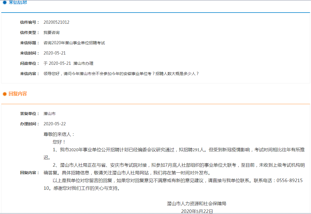 來信內容:領導您好,請問今年潛山市會不會參加今年的安徽事業(yè)單位考?招聘人數(shù)大概是多少人?