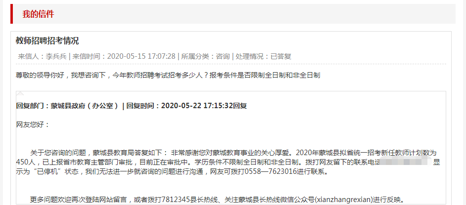 更多問(wèn)題歡迎再次登陸網(wǎng)站留言,或者撥打7812345縣長(zhǎng)熱線(xiàn)、關(guān)注蒙城縣長(zhǎng)熱線(xiàn)微信公眾號(hào)(xianzhangrexian)進(jìn)行反映。