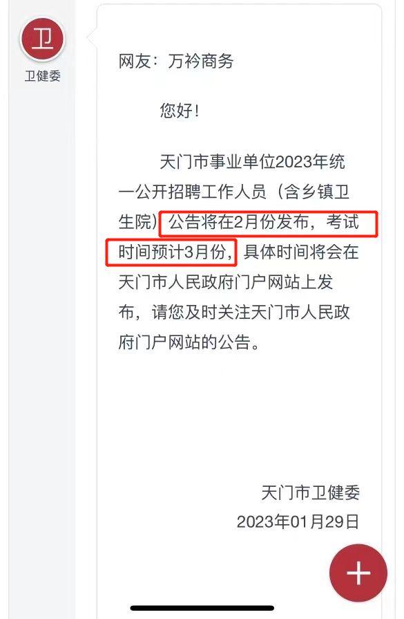 天門衛(wèi)健委回復(fù):天門市事業(yè)單位2023年統(tǒng)一公開招聘工作人員(含鄉(xiāng)鎮(zhèn)衛(wèi)生院)公告將在2月份發(fā)布,考試時間預(yù)計3月份……
