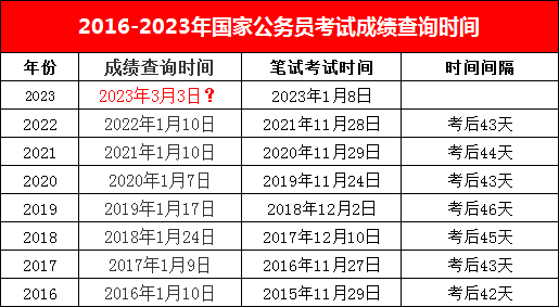 從上圖可以看出,往年國考筆試與成績發(fā)布間隔時間比較固定,在40多天,但截至今天,也就是3月2日,距離國考筆試已經過了51天了,小編預測接下來的每天都有可能會出啊,大家要多多關注報名網站,及時查詢成績。