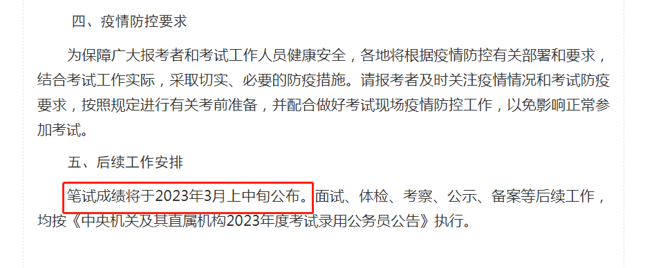 2022年12月16日,國家公務員局發(fā)布了《關于中央機關及其直屬機構2023年度考試錄用公務員筆試時間安排及有關事項的公告》,其中有提到關于國考成績發(fā)布的時間:筆試成績將于2023年3月上中旬公布。