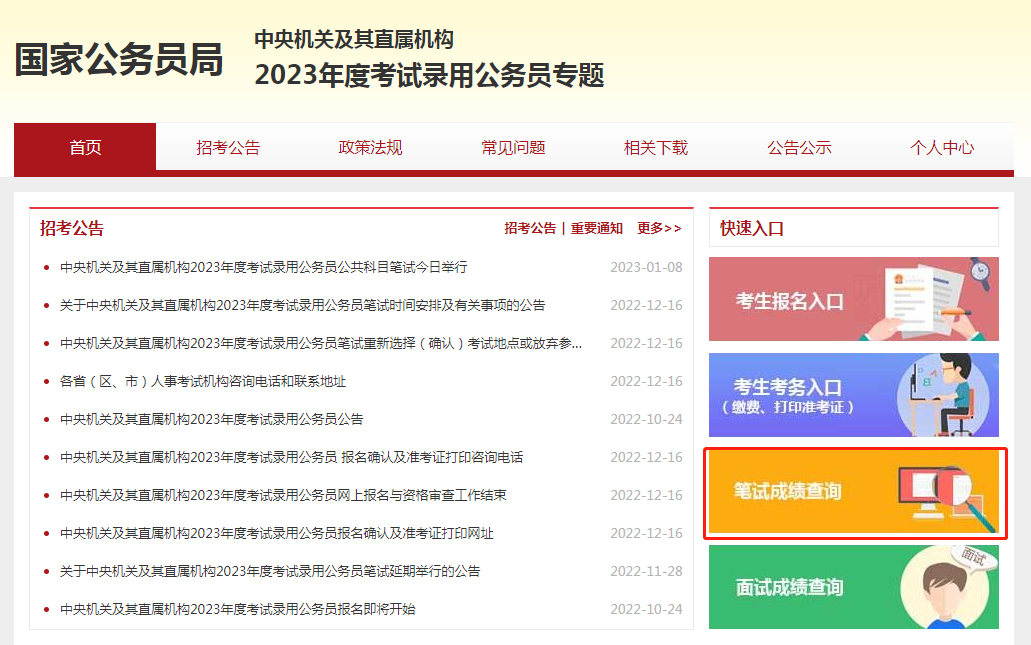 國考成績發(fā)布后,考生通過中央機關及其直屬機構2023年度考試錄用公務員專題網站,進入“筆試成績查詢”網頁即可查成績,進面名單可能會在查成績的同一天發(fā)布,也有可能會延遲一兩天發(fā)布。