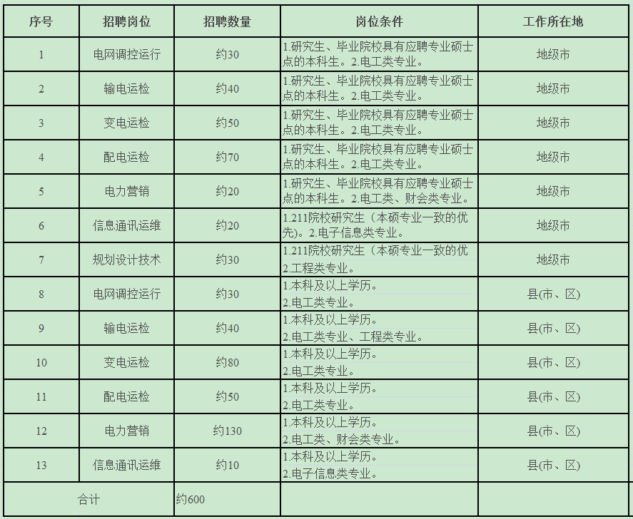 四、招聘流程 報名→資格審查→參加國家電網(wǎng)公司統(tǒng)一筆試→面試→擬錄取→審批→公示→體檢→簽約。 五、需求信息 1.招聘計劃:2018年公司招聘計劃約1000人(包括校園招聘和第一批、第二批集中招聘)。本批次約為600人。 2.用人單位及工作崗位 (1)用人單位 國網(wǎng)濟南供電公司等17家市供電公司,國網(wǎng)山東章丘市供電公司等98家縣供電公司,國網(wǎng)山東省電力公司電力科學研究院、國網(wǎng)山東省電力公司經(jīng)濟技術(shù)研究院、國網(wǎng)山東省電力公司檢修公司、山東送變電工程公司、國網(wǎng)山東省電力公司信息通信公司、山東魯能智能技術(shù)有限公司、山東魯能軟件技術(shù)有限公司等單位。 (2)工作崗位