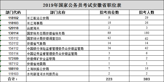 2019國家公務員考試職位表(安徽招383人,共223個崗位) |